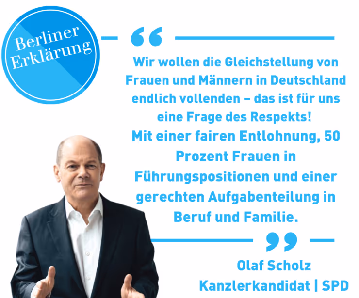 Mit Aktionen, Gesprächen mit Spitzenpolitiker*innen der Parteien, offenen Briefen und Pressemitteilungen macht die Berliner Erklärung auf die mangelnde Gleichberechtigung von Frauen und Männern aufmerksam. Nach Gesprächen mit Ricarda Lang von Bündnis 90/Die Grünen und Janine Wissler von Die Linke sprachen die Initiatorinnen der Berliner Erklärung auch mit Kanzlerkandidat Olaf Scholz von der SPD über ihre Forderungen. In Bezug auf die gleichstellungspolitischen Ziele seiner Partei sagte er: