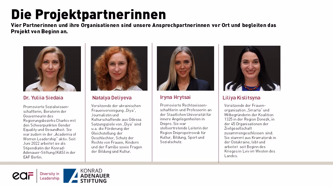 In Kooperation mit vier lokalen Partnerinnen entwickelte die EAF ein Trainingstool für die genannten Zielgruppen. Die qualifizierten und engagierten ostukrainischen Partnerinnen, die Organisations- und Projekterfahrung aus Politik, Medien, Zivilgesellschaft und Wissenschaft mitbringen, sollten das Projekt vor Ort begleiten, als Kulturmittlerinnen und Kontaktpersonen fungieren.